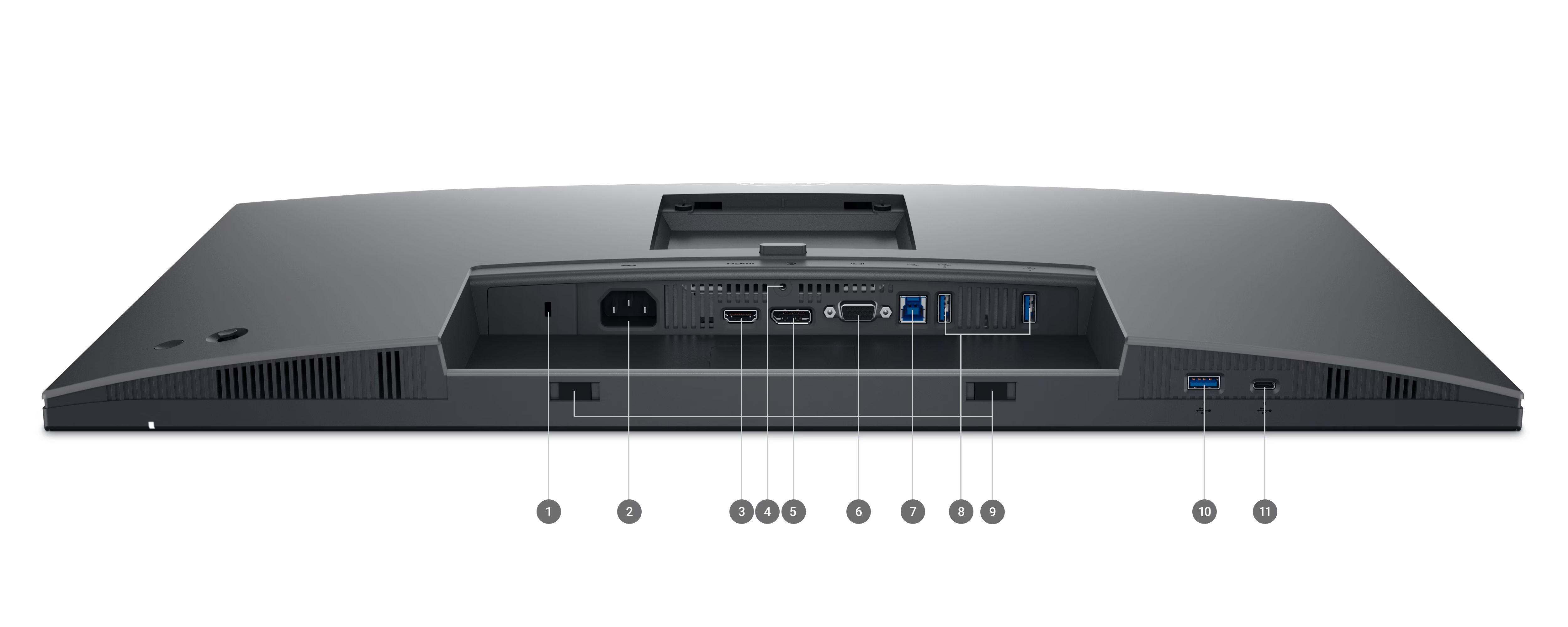 Dell P2725H được trang bị hệ thống cổng kết nối đầy đủ: Cổng hiển thị: 1x HDMI 1.4, 1x DisplayPort 1.2, 1x VGA. Cổng dữ liệu: 1x USB 3.2 Gen1 Type-B (upstream), 3x USB 3.2 Gen1 Type-A (downstream), 1x USB 3.2 Gen1 Type-C (downstream, hỗ trợ sạc 15W, truyền dữ liệu)