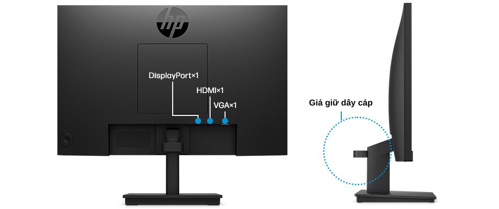 Nhờ có nhiều cổng đầu vào như HDMI, DisplayPort và VGA, màn hình có thể kết nối linh hoạt với nhiều thiết bị khác nhau như máy tính, laptop hoặc máy chơi game. Ngoài ra, giá giữ dây cáp phía sau giúp sắp xếp gọn gàng, tránh tình trạng dây điện bị rối.